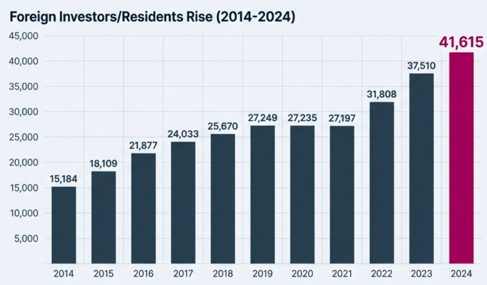 • 투자자 급증: 2014년 15,184명 수준이던 외국인 투자자/거주자가 2024년 41,615명으로 10년 만에 약 2.7배 증가했습니다.